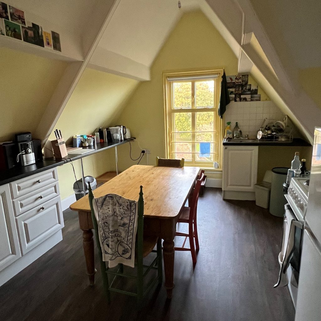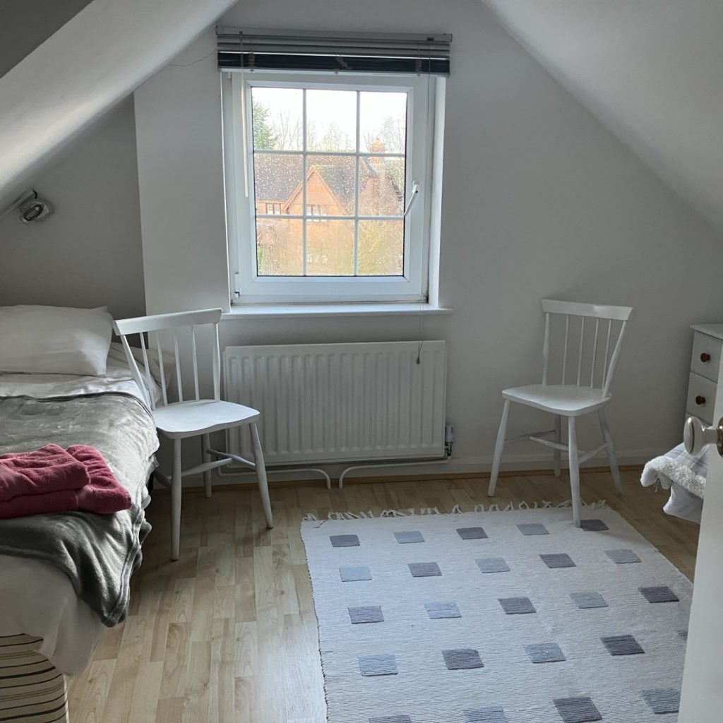 The accommodation on offer is a single eaves bedroom at the top of the house, plus a bathroom primarily for their use (shared if the Host has guests to stay), and shared use of the kitchen, sitting room and garden. There is an additional shower room on the ground floor. There is a spare fridge/freezer in the utility room for the Helpful Housemate’s sole use, and parking on the drive.